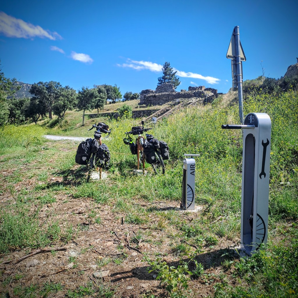 Superar el Col de Panissars no fue sencillo, pero al coronar nos encontramos con un espacio que transmite la esencia de lo que debería ser EuroVelo: bancos con mesas, aparcamiento para bicicletas y hasta una estación móvil de mecánica. Un lugar pensado y cuidado para el cicloturismo.