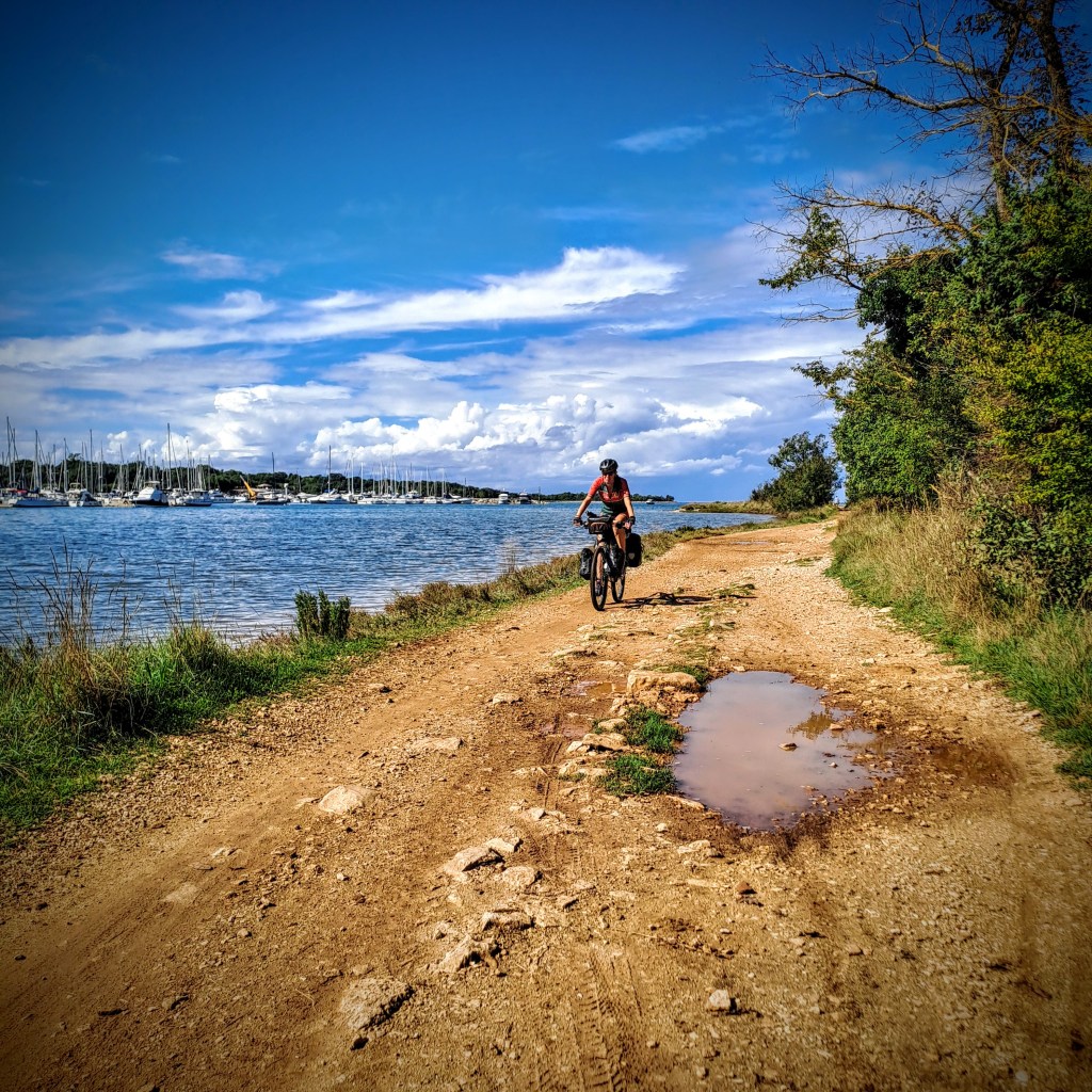 Entramos en Croacia y el contraste es fuerte: los primeros 10 km son de grava, luego carreteras sin arcén, con coches circulando como si fuera Fórmula 1. Los últimos km, dentro de Umago, encontramos una bonita ciclovía segura, pero en todo el tramo no aparece ni una señal EuroVelo.